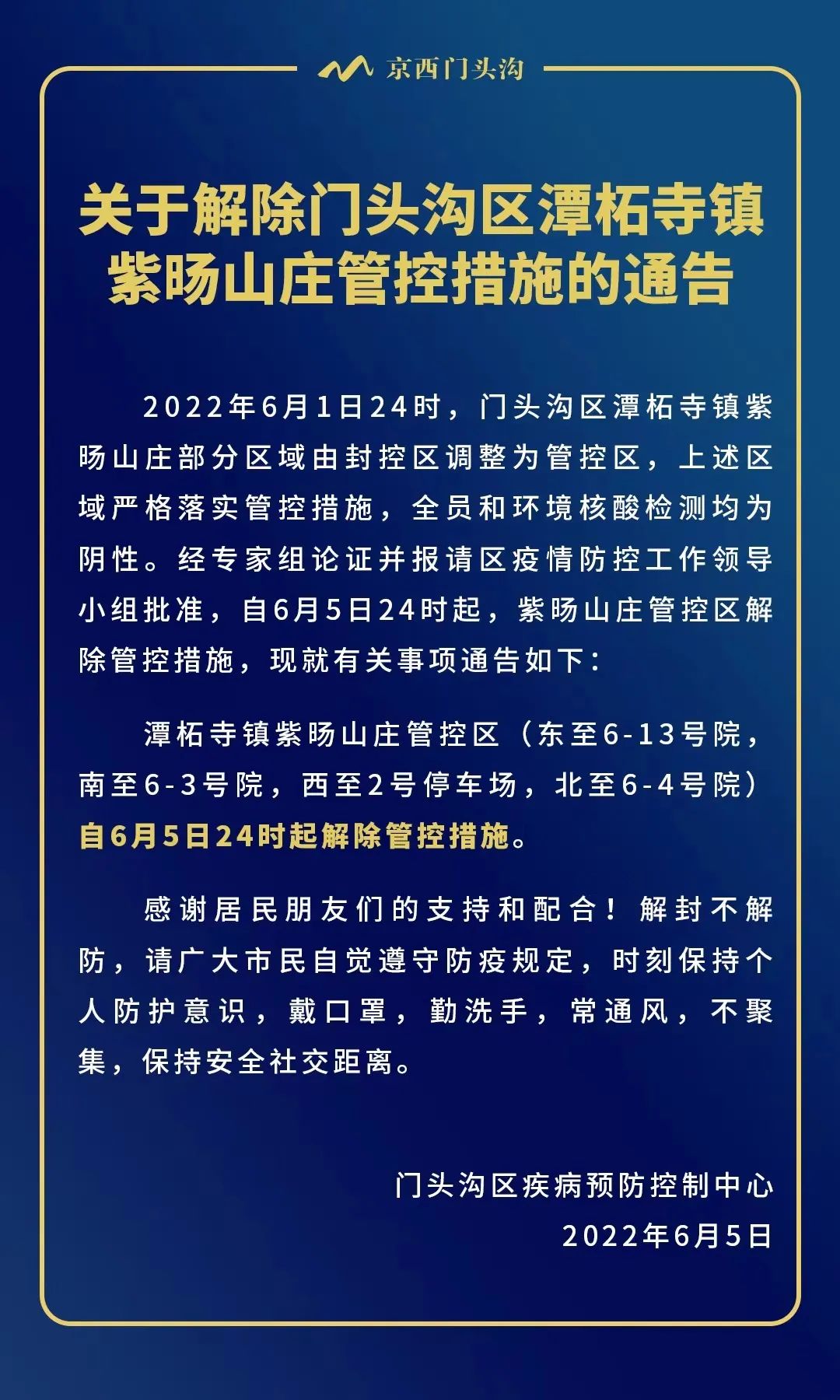 新京报讯 6月6日,北京门头沟区委员会宣传部在其官微发布关于解除潭柘寺镇紫旸山庄管控措施的通告,全文如下: