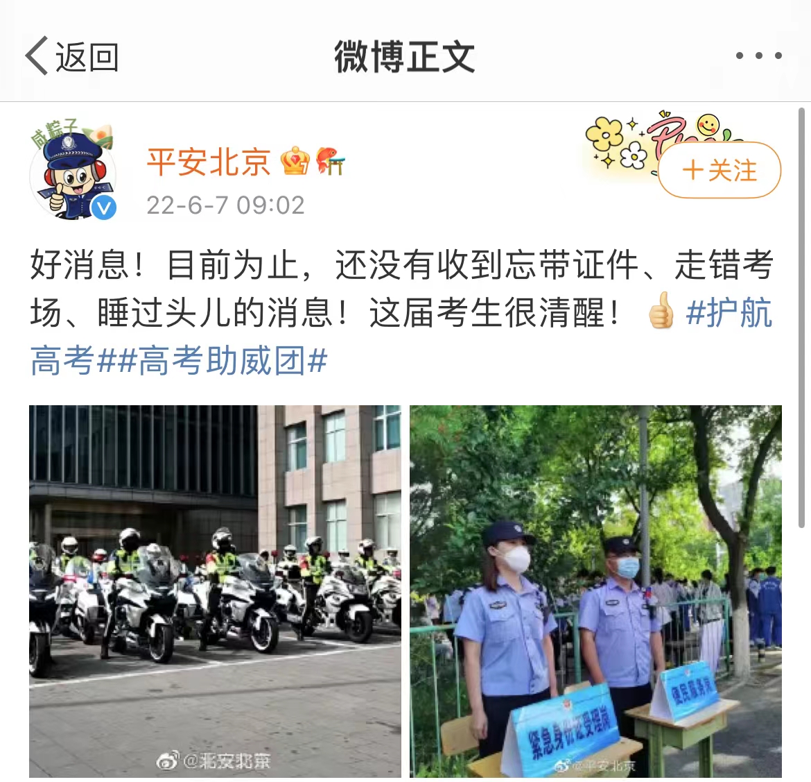 6月7日上午9点,高考首场考试语文科目正式开考。9点02分,北京警方官方微博发布消息称,“目前为止,还没有收到忘带证件、走错考场、睡过头儿的消息!这届考生很清醒!”