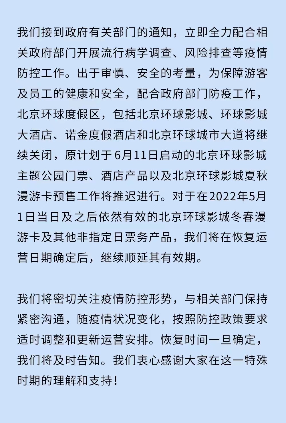 新京报贝壳财经讯 6月10日,北京环球度假区发布公告称,北京环球度假区,包括北京环球影城、环球影城大酒店、诺金度假酒店和北京环球城市大道将继续关闭,原计划于6月11日启动的北京环球影城主题公园门票、酒店产品以及北京环球影城夏秋漫游卡预售工作将推迟进行。