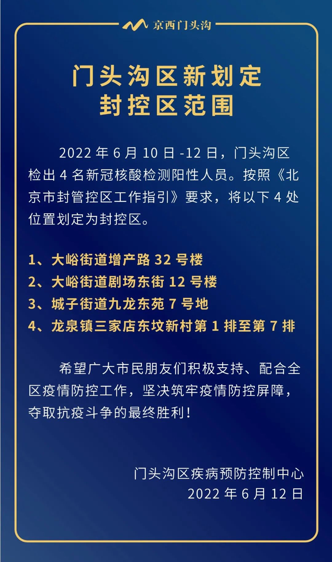 新京报讯 6月12日,北京门头沟官微发布新划定封控区范围,详情如下: