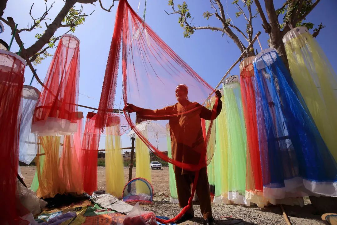 当地时间2022年3月16日,巴基斯坦白沙瓦,民众出售防蚊蚊帐。巴基斯坦每年都有数百人因蚊虫叮咬而患上登革热。图/IC photo