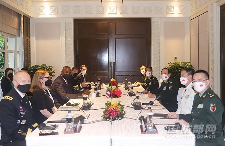 ▲6月10日,出席香格里拉对话会的国务委员兼国防部长魏凤和与同期参会的美国国防部长奥斯汀举行会谈。图/国防部官网
