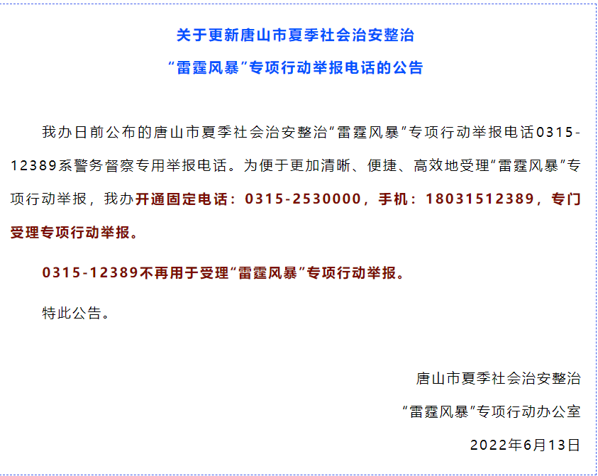 河北唐山:夏季社会治安整治“雷霆风暴”专项行动举报电话已更新