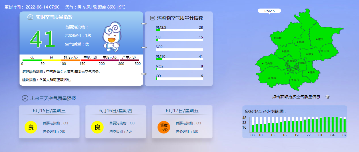 据北京市生态环境监测中心今早7时数据,目前实时空气质量指数41,污染级别1级,空气质量优。
