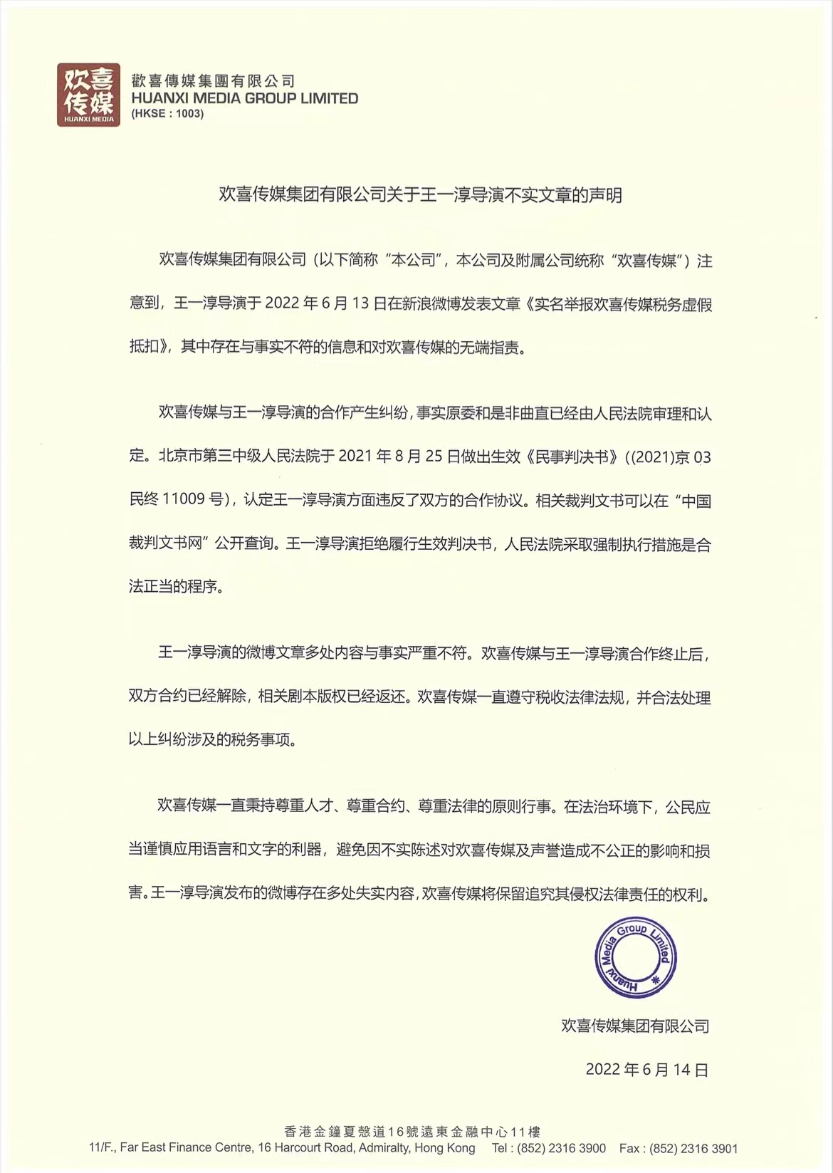 6月14日,欢喜传媒公开回应称,“王一淳导演的微博文章多处与事实严重不符”,“欢喜传媒与王一淳导演的合作产生纠纷,事实原委和是非曲直已经由人民法院审理和认定”。