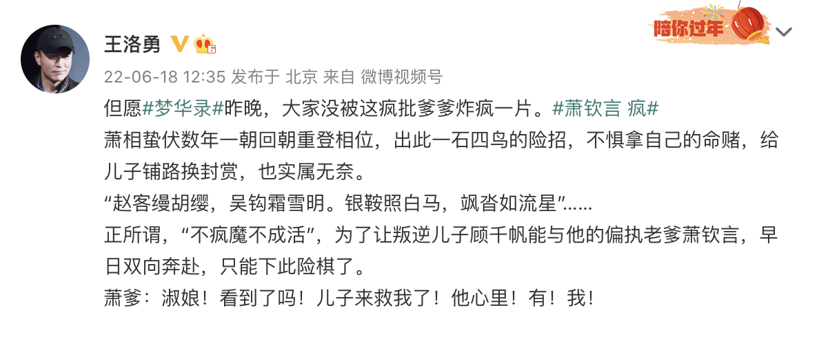 王洛勇发文称:“萧相蛰伏数年一朝回朝重登相位,出此一石四鸟的险招,不惧拿自己的命赌,给儿子铺路换封赏,也实属无奈。‘赵客缦胡缨,吴钩霜雪明。银鞍照白马,飒沓如流星’……正所谓‘不疯魔不成活’,为了让叛逆儿子顾千帆能与他的偏执老爹萧钦言,早日双向奔赴,只能下此险棋了。萧爹:淑娘!看到了吗!儿子来救我了!他心里有我!”