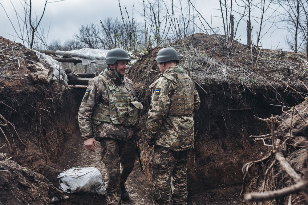 4月11日,两名乌克兰士兵在顿巴斯地区的一处战壕内。(新华社发,迭戈·埃雷拉摄)