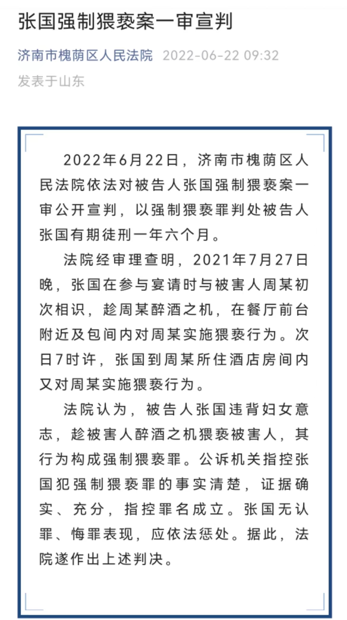 新京报讯 据济南市槐荫区人民法院官微消息,2022年6月22日,济南市槐荫区人民法院依法对被告人张国强制猥亵案一审公开宣判,以强制猥亵罪判处被告人张国有期徒刑一年六个月。