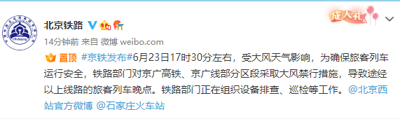 新京报讯 据@北京铁路微博消息,6月23日17时30分左右,受大风天气影响,为确保旅客列车运行安全,铁路部门对京广高铁、京广线部分区段采取大风禁行措施,导致途经以上线路的旅客列车晚点。铁路部门正在组织设备排查、巡检等工作。