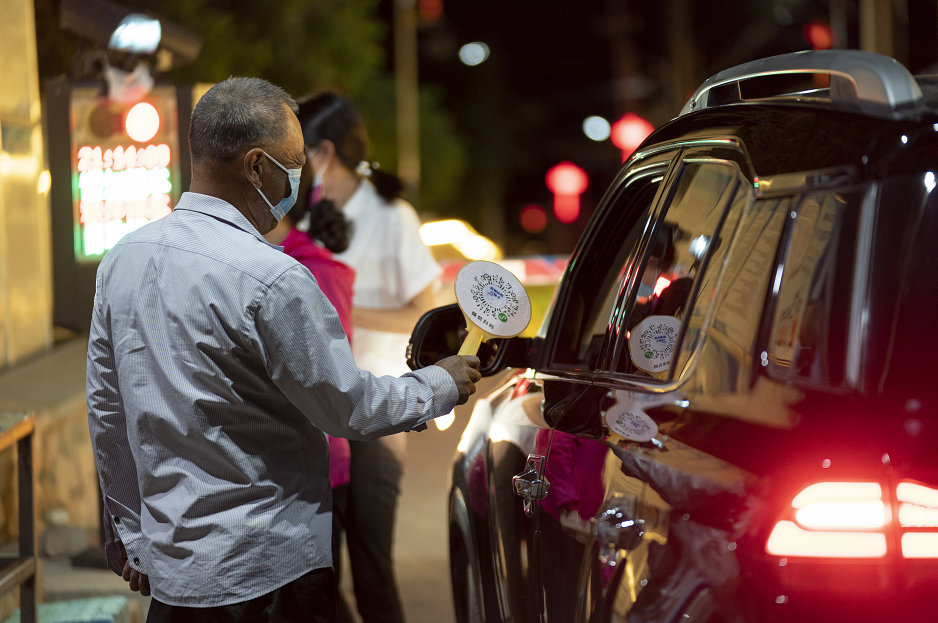 6月6日,北京,延庆区后黑龙庙村,村口值守人员对入村人员进行扫码测温。 新京报记者 陶冉 摄