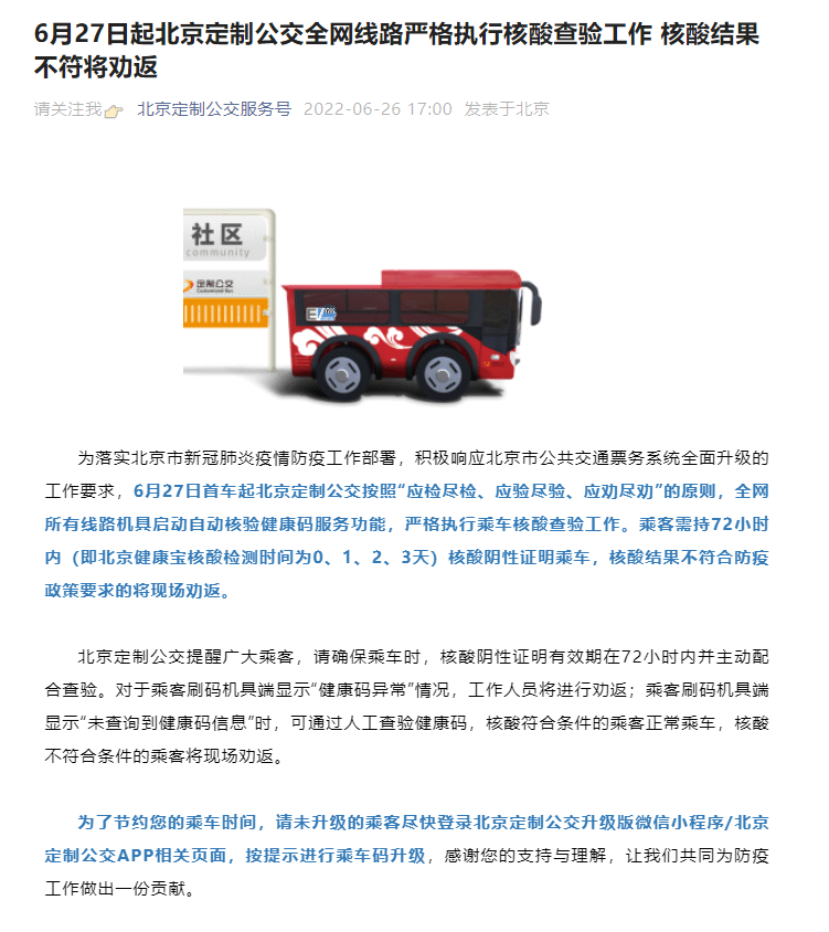 新京报讯 据北京定制公交服务号消息,为落实北京市新冠肺炎疫情防疫工作部署,积极响应北京市公共交通票务系统全面升级的工作要求,6月27日首车起北京定制公交按照“应检尽检、应验尽验、应劝尽劝”的原则,全网所有线路机具启动自动核验健康码服务功能,严格执行乘车核酸查验工作。乘客需持72小时内(即北京健康宝核酸检测时间为0、1、2、3天)核酸阴性证明乘车,核酸结果不符合防疫政策要求的将现场劝返。