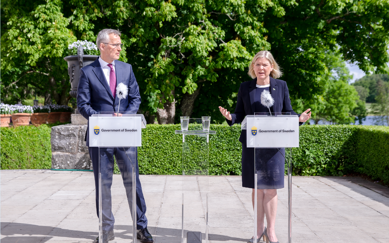 ▲6月13日,瑞典首相安德松(右)与到访的北约秘书长斯托尔滕贝格在瑞典首都斯德哥尔摩出席新闻发布会。斯托尔滕贝格表示,瑞典和芬兰申请加入北约的流程比预期复杂,两国获准入约的具体时间“无法确定”。图/新华社