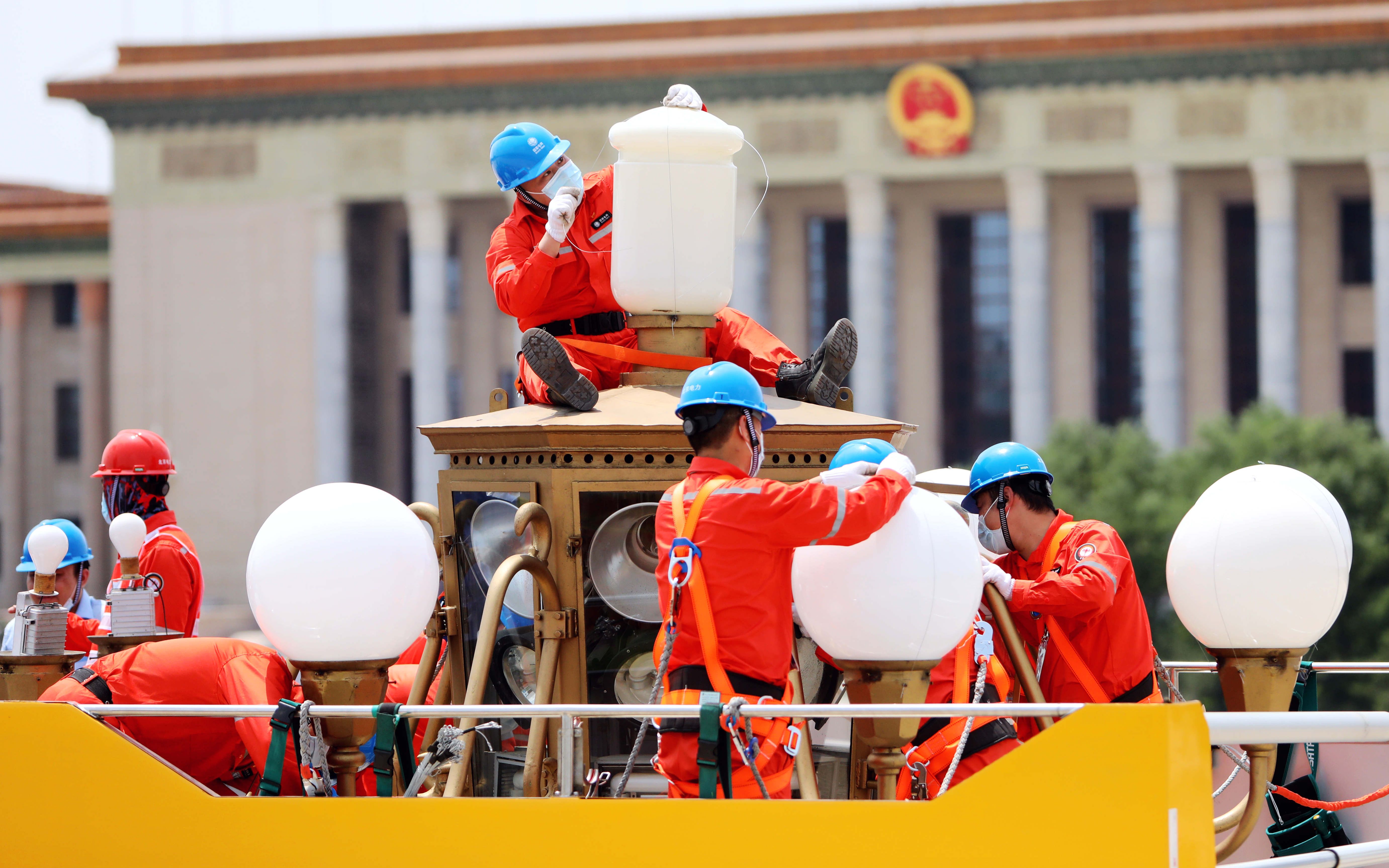 为了保障天安门广场及长安街华灯安全稳定运行,华灯班每年都会对华灯开展一次清洗检修。在往年华灯清扫检修范围的基础上,今年将由内而外进行华灯的全面检修。