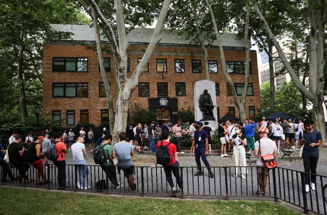 当地时间2022年6月23日,美国纽约市民众在接种诊所外排队,等待接种猴痘疫苗。图/IC photo