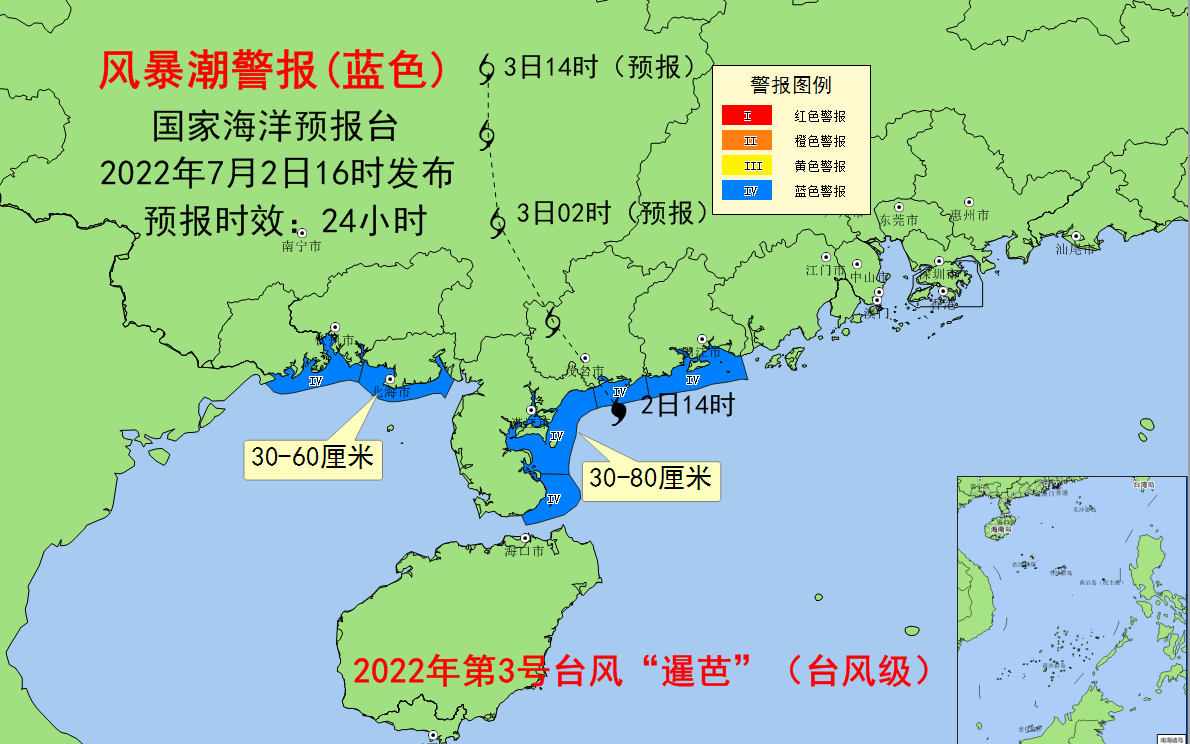 在风暴潮方面,预计7月2日傍晚到3日上午,粤西和雷州半岛东岸沿海将出现30到80厘米的风暴增水,广西沿海将出现30到60厘米的风暴增水。上述岸段内的潮位站将不会出现达到当地蓝色警戒潮位的高潮位,风暴潮预警级别为蓝色。