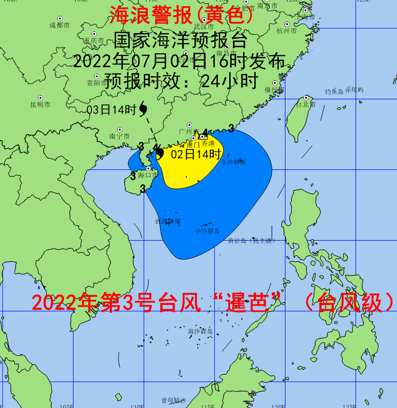 在海浪方面,预计7月2日夜间到3日白天,南海北部将出现3到5米的大浪到巨浪区,北部湾将出现2.5到3.5米的大浪区;广东近岸海域将出现2.5到4米的大浪到巨浪区,该近岸海域海浪预警级别为黄色;海南东部近岸海域将出现2到3米的中浪到大浪区,该近岸海域海浪预警级别为蓝色;广西近岸海域将出现2到2.5米的中浪到大浪区,该近岸海域海浪预警级别为蓝色。
