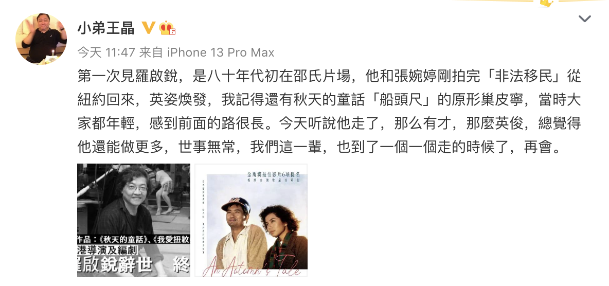 王晶发文称,第一次见罗启锐,是上世纪八十年代初在邵氏片场:“当时大家都年轻,感到前面的路很长。今天听说他走了,那么有才,那么英俊,总觉得他还能做更多,世事无常,我们这一辈,也到了一个一个走的时候了,再会。”