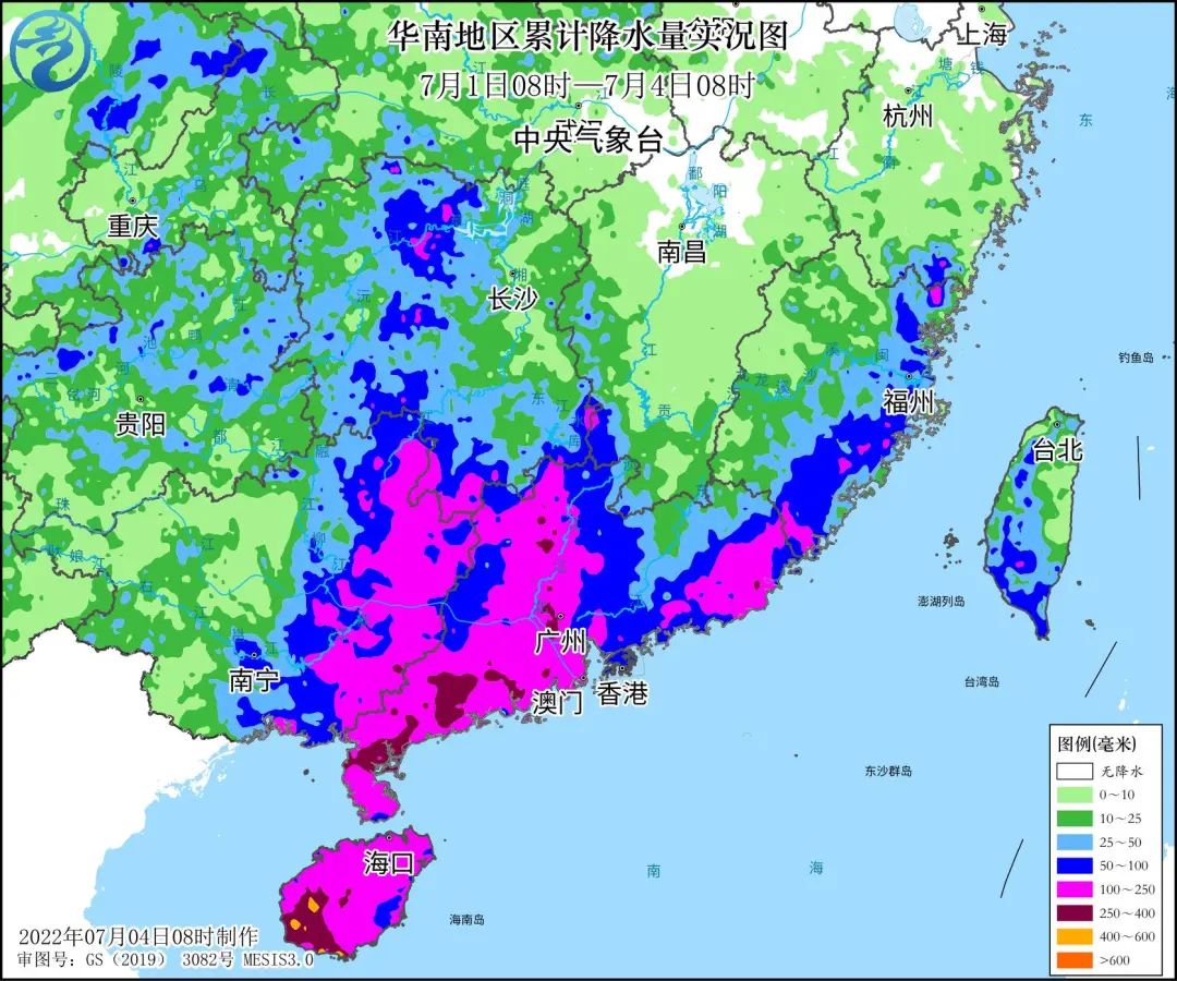 受其影响,7月1日至3日,海南岛、广东中西部和南部沿海、广西东南部、湖南南部、福建东南部等地出现大暴雨或特大暴雨,海南岛西南部、广东西南部等局地累计降雨量达400~500毫米,海南昌江达581毫米;海南、广东、广西等地超过50个测站的日雨量达到特大暴雨量级,海南三亚国家气象观测站突破当地日雨量历史极值。