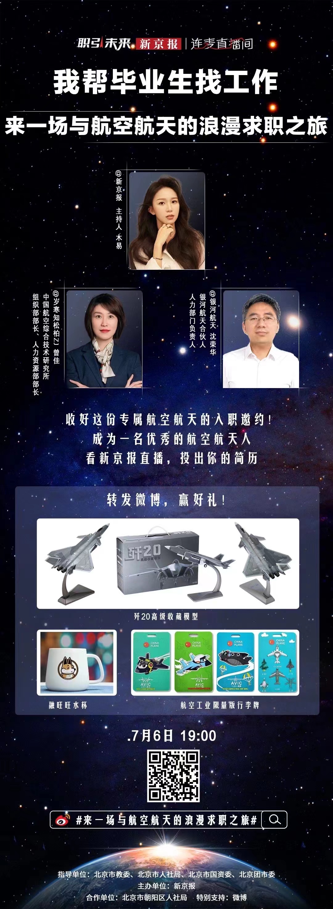 新京报讯(记者张建林)“来一场与航空航天的浪漫求职之旅”,7月6日19时,新京报“职引未来——我帮毕业生找工作”特别行动航空航天专场开启,此次直播招聘为该系列活动的第三场。中国航空综合技术研究所、银河航天两家用人单位招聘相关负责人亮相新京报微博直播间,介绍今年毕业季的招聘岗位需求,并为观众答疑解惑。