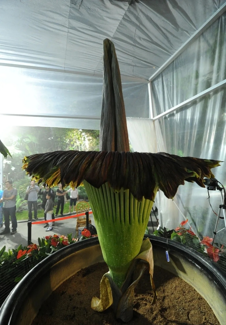 巨魔芋是天南星科魔芋属植物,原产于印度尼西亚西部苏门答腊岛热带密林中,是世界珍稀濒危植物队伍中的“旗舰种”。它有着世界上最大的不分枝花序,肉穗花序包括五百多枚雌花和两千多枚雄花。花序的高度可达3米左右,因此也被称为“花序之王”。