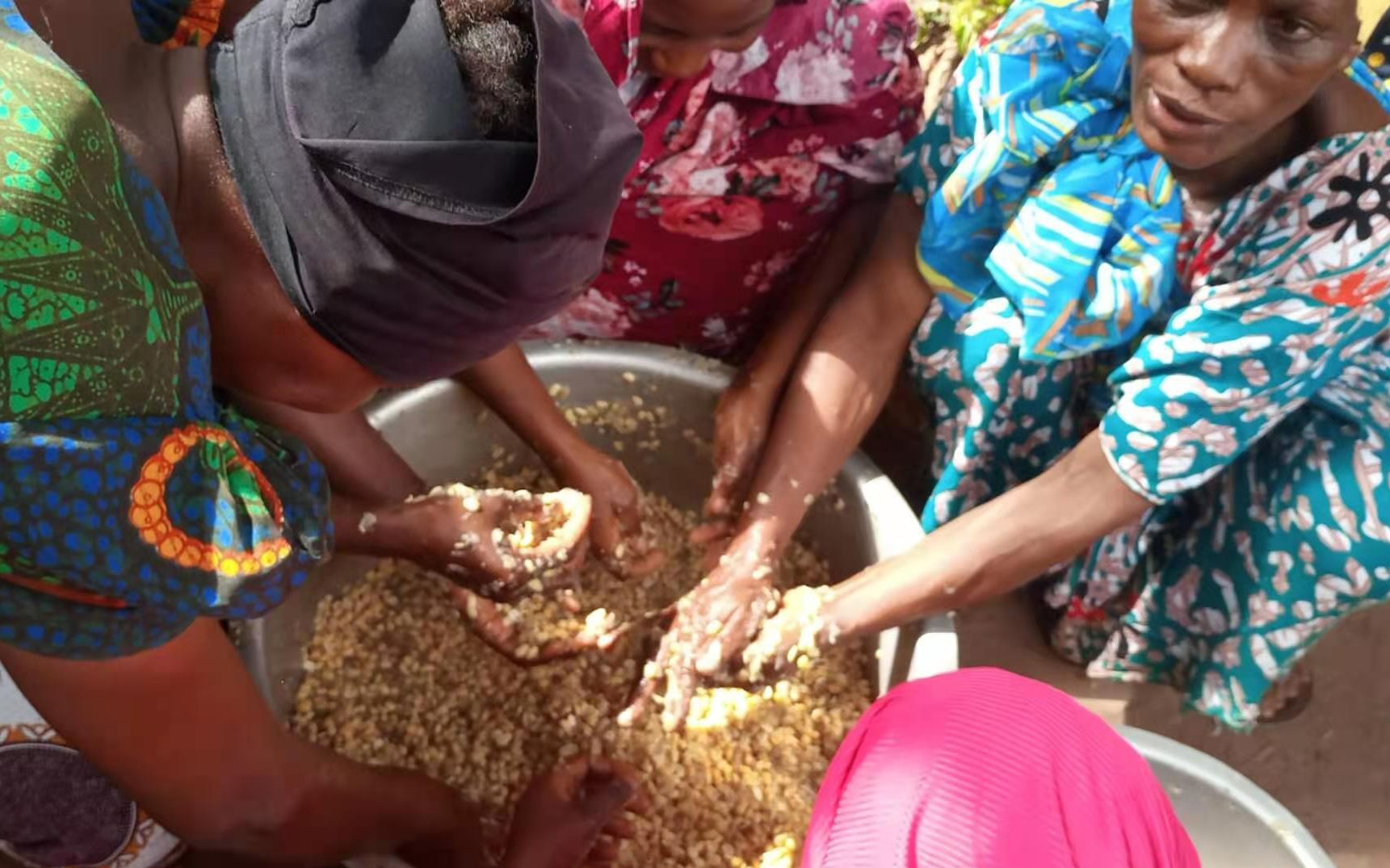 2022年6月24日,位于非洲东部的坦桑尼亚莫罗戈罗省柯泰特村,第一次收获大豆的村民们,正在技术人员的指导下,尝试各种豆制品的制作。村民们收获了大豆,也开始学习来自世界另一端的豆制品制作技术。