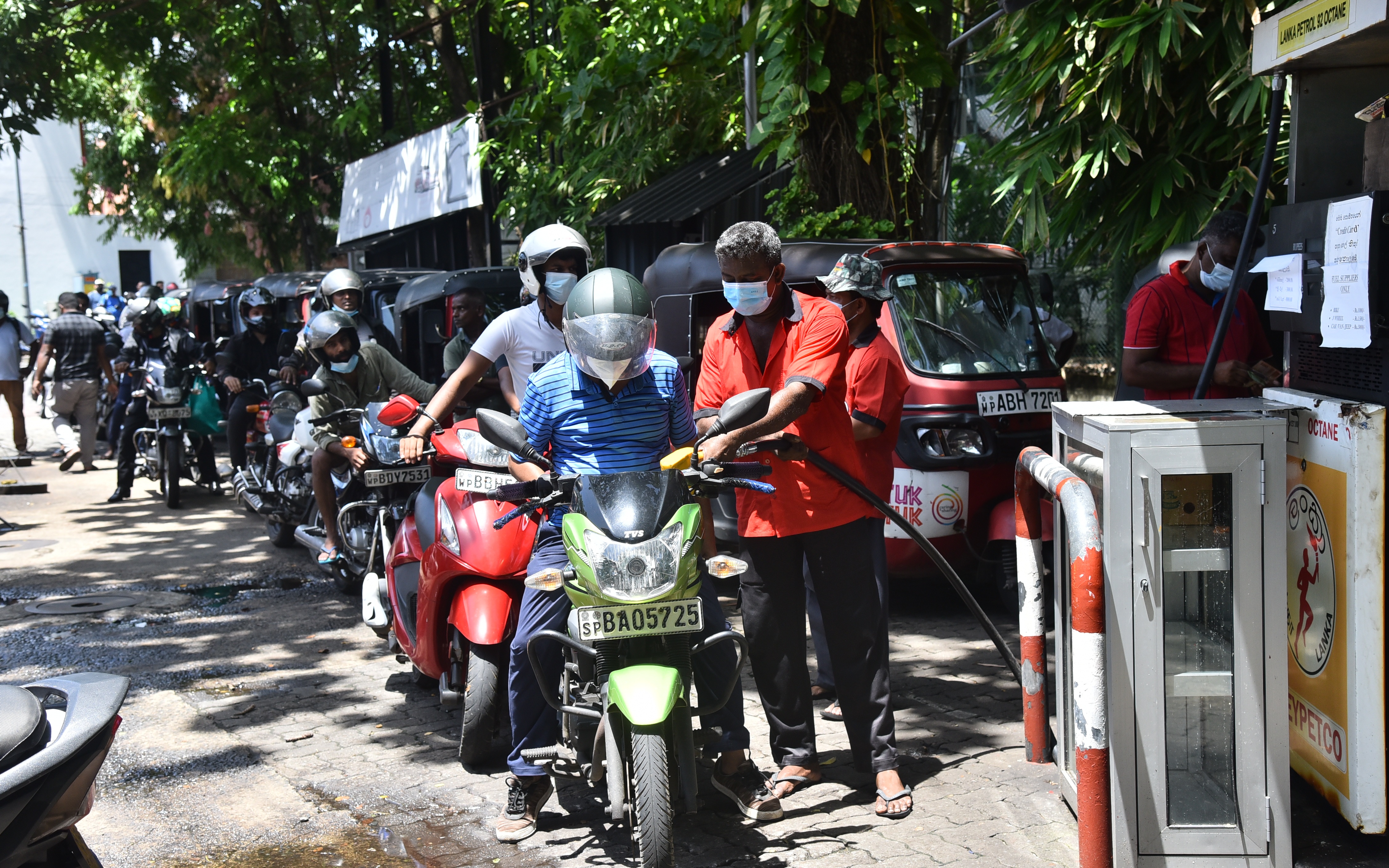 ▲5月16日,摩托车在斯里兰卡首都科伦坡一处加油站附近排队加油。图/新华社