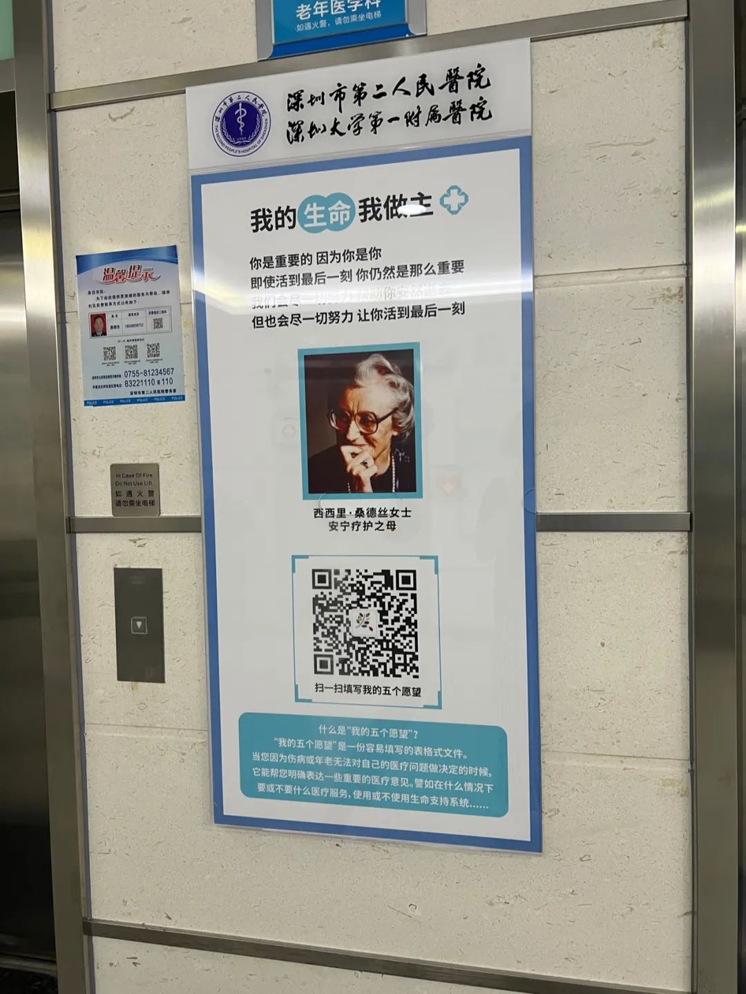 在深圳市第二人民医院外科大楼22楼老年医学科的电梯间,张贴着“生前预嘱”的推广信息。新京报记者 陈亚杰 摄