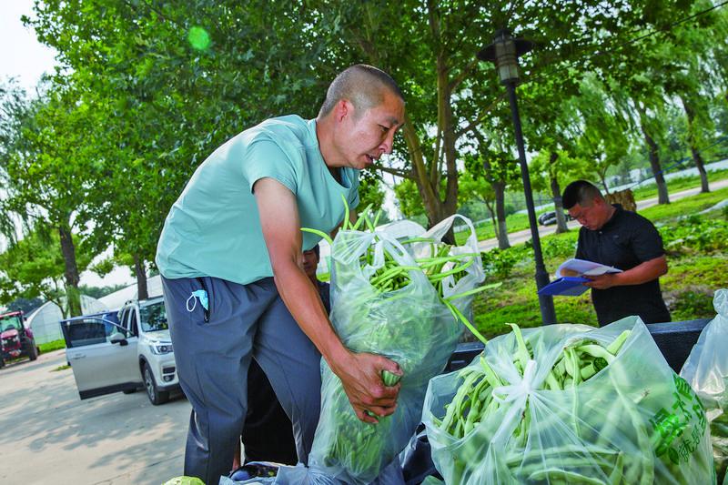 6月26日,朝阳区黑庄户乡鲁店农场,农机管理组长刘闫和同事一起将清晨摘好的蔬菜装车发货。新京报记者 王子诚 王飞 摄