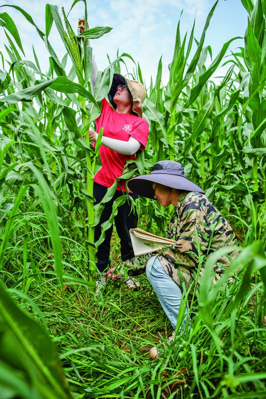 6月28日,宁国法与研究生学妹张晓恬在玉米试验地里测量数据。新京报记者 王子诚 王飞 摄