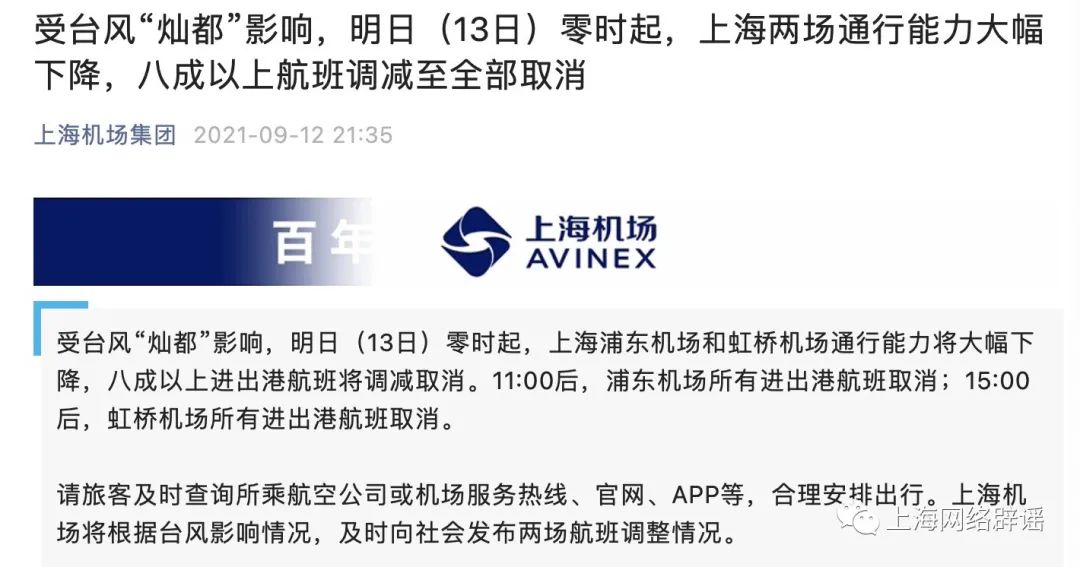 上海辟谣平台核查发现,网传说法疑似是对2021年9月12日一则信息的旧闻重炒。公众号“上海机场集团”当日推送文章称,根据受台风“灿都”影响,9月13日零时起,上海浦东机场和虹桥机场通行能力将大幅下降,八成以上进出港航班将调减取消。11:00后,浦东机场所有进出港航班取消;15:00后,虹桥机场所有进出港航班取消。