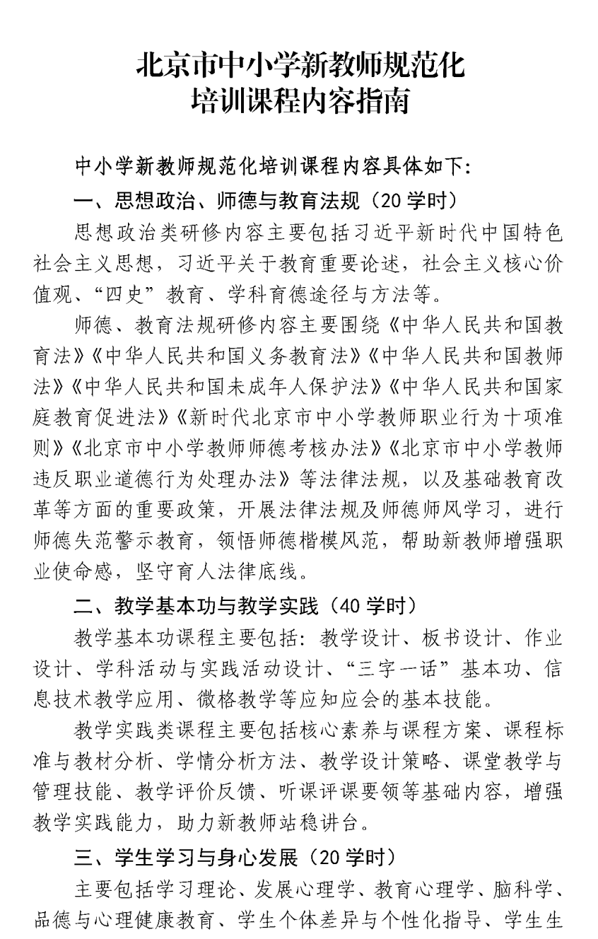 新京报讯 据首都教育官微消息,为进一步加强北京市中小学幼儿园新教师培训制度化、规范化建设,切实做好北京市中小学幼儿园新教师规范化培训,北京市教委出台了《北京市中小学新教师规范化培训指导意见》《北京市幼儿园新入职教师规范化培训指导意见》。