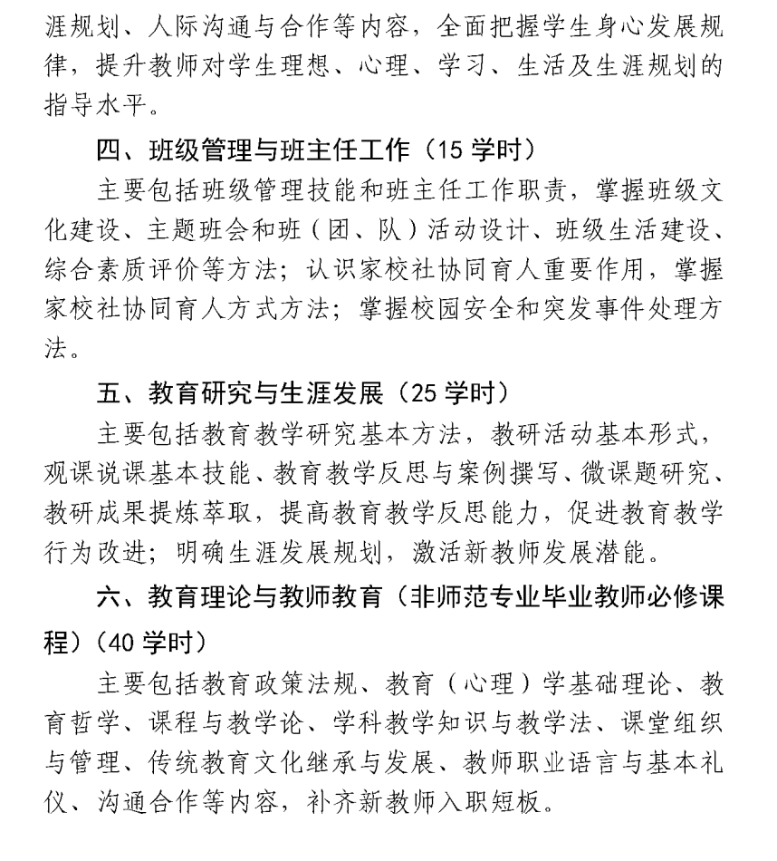 第一阶段:第一年集中开展入职通识教育课程培训(120学时),内容以教育教学基本功为重点,注重教育理论与学科专业实践相结合。针对新教师专业背景,课程设置分为思想政治、师德与教育法规、教学基本功与教学实践、学生学习与身心发展、班级管理与班主任工作、教育研究与生涯发展等五个模块。非师范专业毕业教师增加“教育理论与教师教育”课程,完善教师教育专业知识结构。