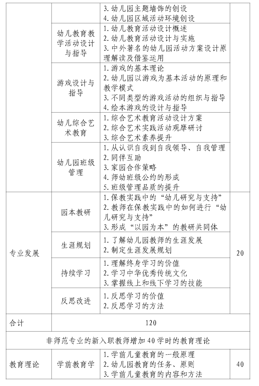 幼儿园新入职教师课程以保教基本功为重点,注重教育理论与实践相结合。针对新教师专业背景,课程设置分为思想政治、师德与职业规范、幼儿发展、幼儿保育与教育、专业发展4个模块。非师范专业毕业教师增加“教育理论与教师教育”课程,完善教师教育专业知识结构。