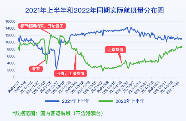 2021年上半年和2022年同期实际航班量分布。