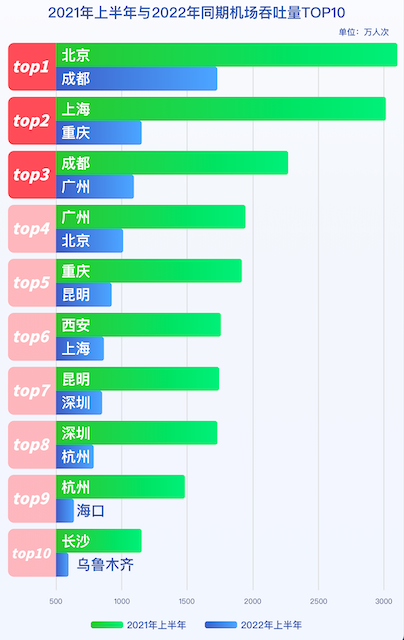 2021年上半年与2022年同期机场吞吐量TOP10。