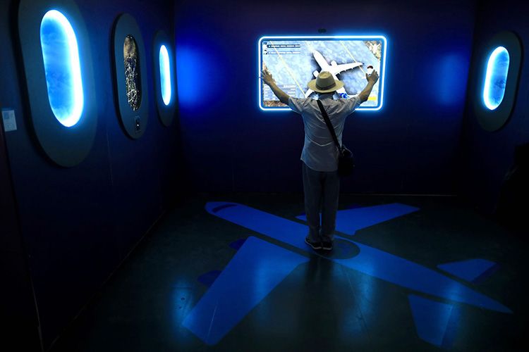 观众通过游戏“驾驶飞机”。
