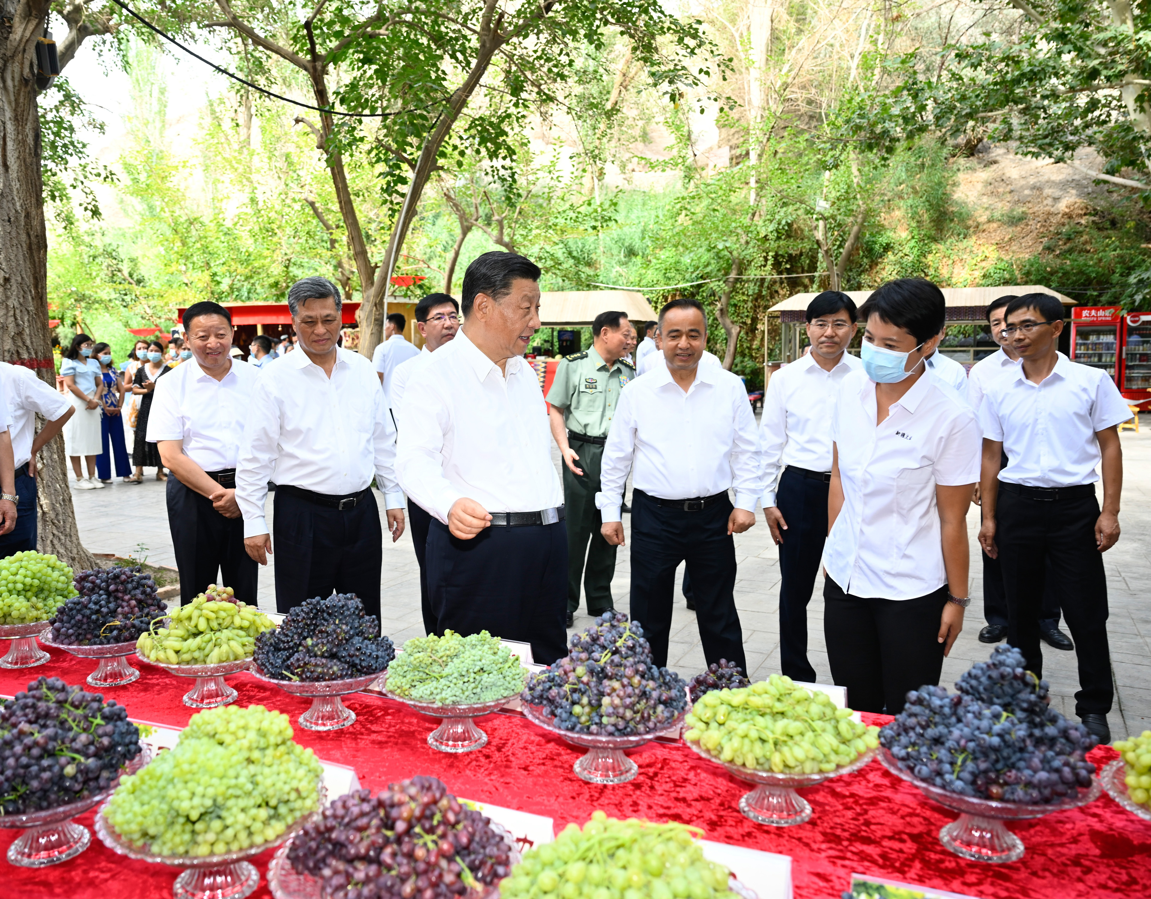 据人民日报消息,14日下午,习近平总书记来到新疆吐鲁番市,先后考察了葡萄沟、高昌区亚尔镇新城片区新城西门村、交河故城,了解当地发展特色产业、推进乡村振兴、文化遗产保护利用等情况。
