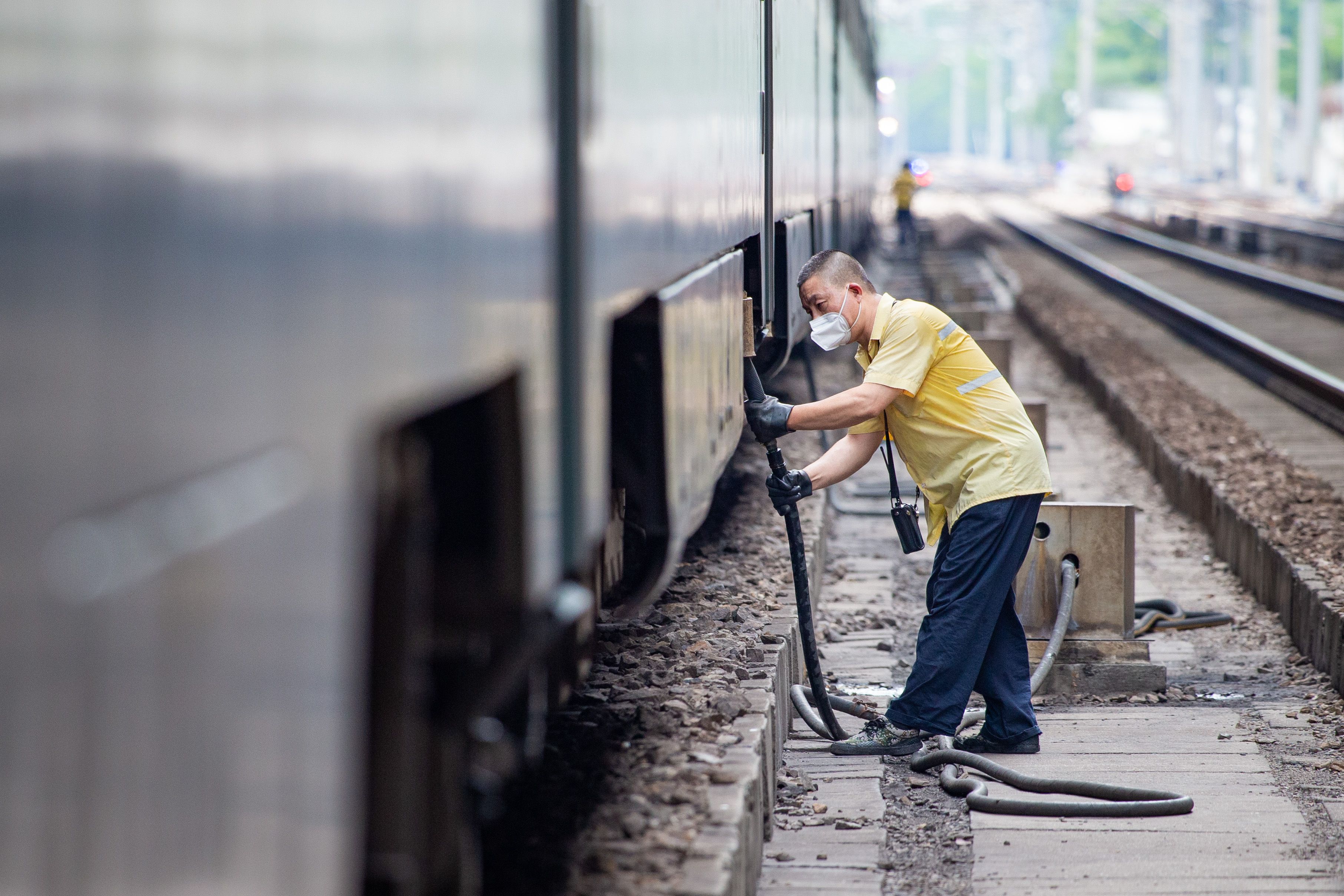 7月14日,江苏南京,高温天气持续,火车站的上水工在为旅客列车加水。图/IC photo