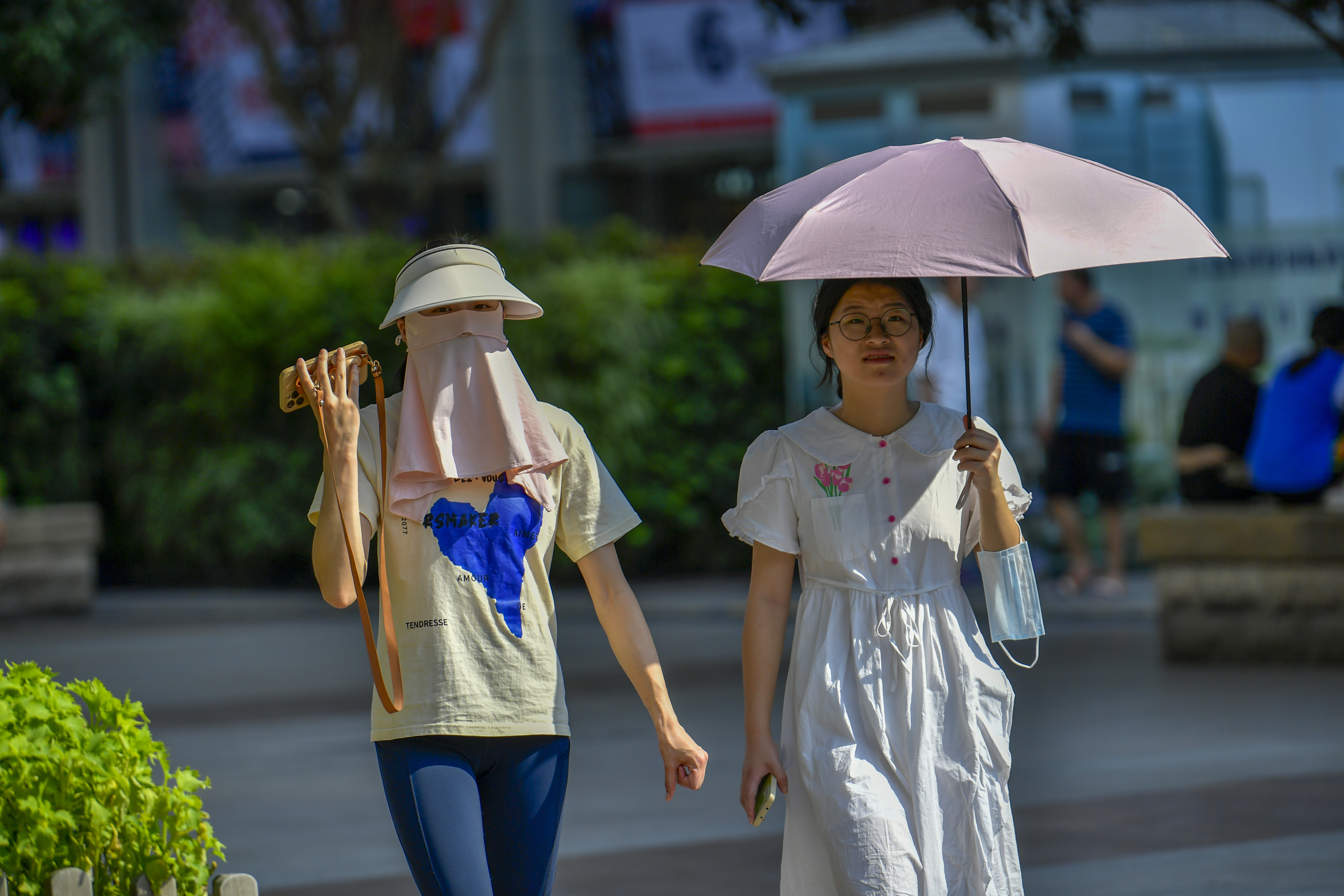 7月13日下午,重庆观音桥步行街,市民冒着高温出行,一位女士为防晒将面部蒙住。图/IC photo