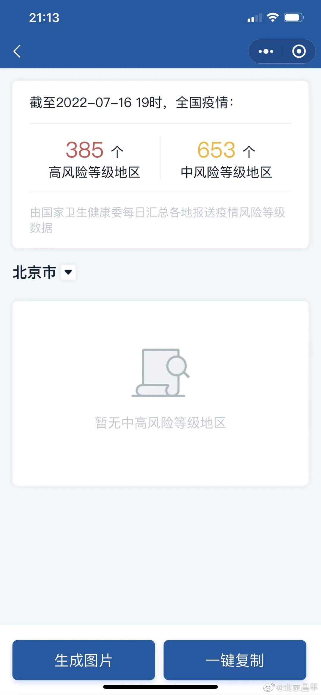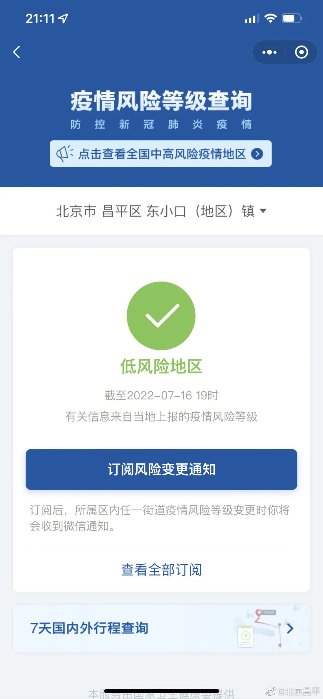 新京报讯 据北京昌平官博消息,据国务院客户端小程序显示,截至7月16日19时,北京市昌平区东小口镇中东路121号院已不在中风险区中显示,该地已显示为低风险地区。至此,北京高中风险区已清零。