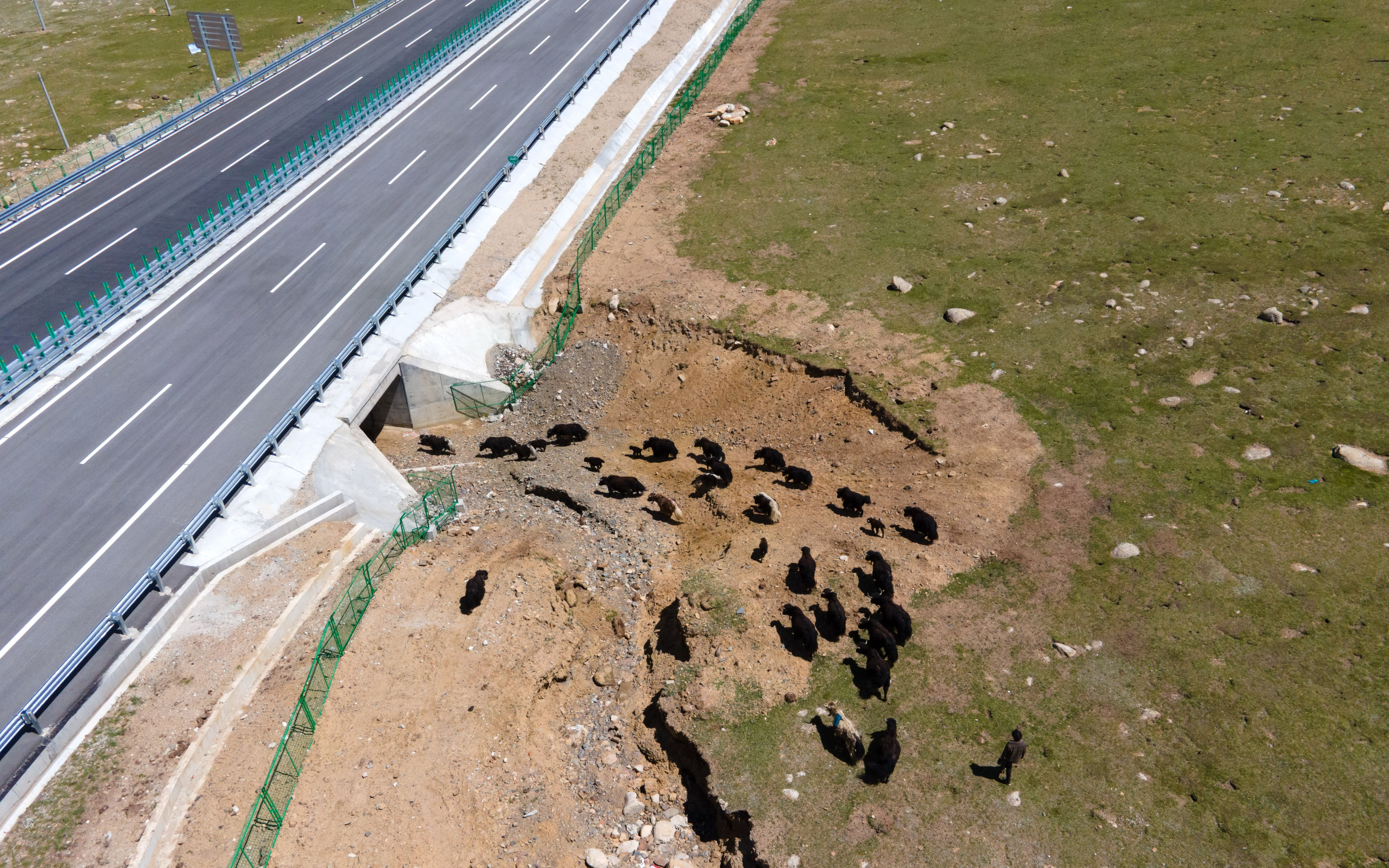 2021年6月29日,G6京藏高速公路那曲至拉萨段,那曲当地牧民的牦牛群通过那拉高速。该项目投入重金,在沿线预留设置野生动物及牲畜通道。图/IC photo