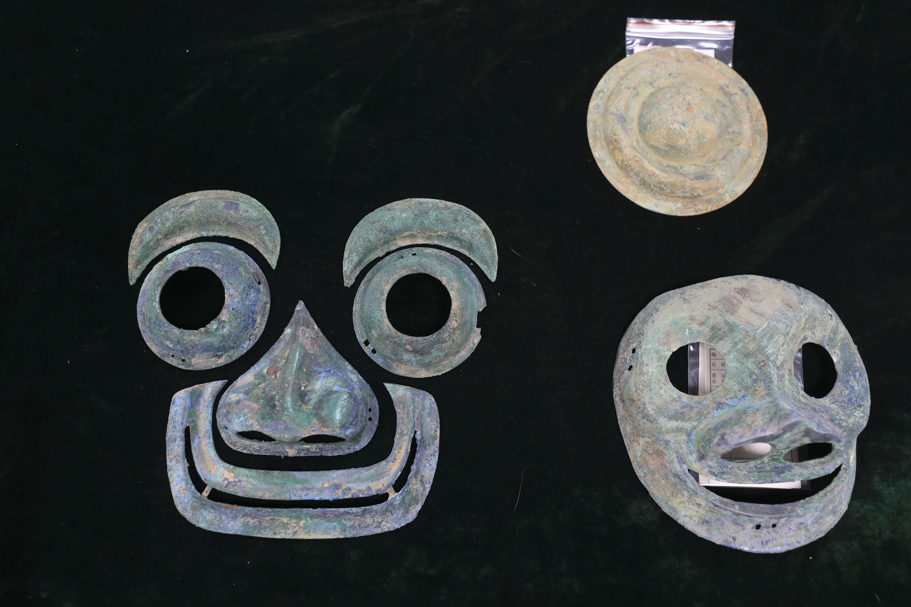 7月20日,房山区琉璃河遗址,去年考古发掘出土的盾牌上的青铜面具饰品。 新京报记者 浦峰 摄