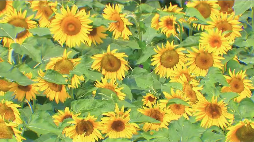 油葵园中,一片金色花海。有的正在含苞待放,有的初露花盘蓄势待放。从高空俯瞰,一株株长势喜人的油葵探着“脑袋”向阳而生,仿佛以片片绿叶为底稿,在上面勾勒了无数个金灿灿的“小太阳”,成为镇罗营镇新晋“网红打卡地”。