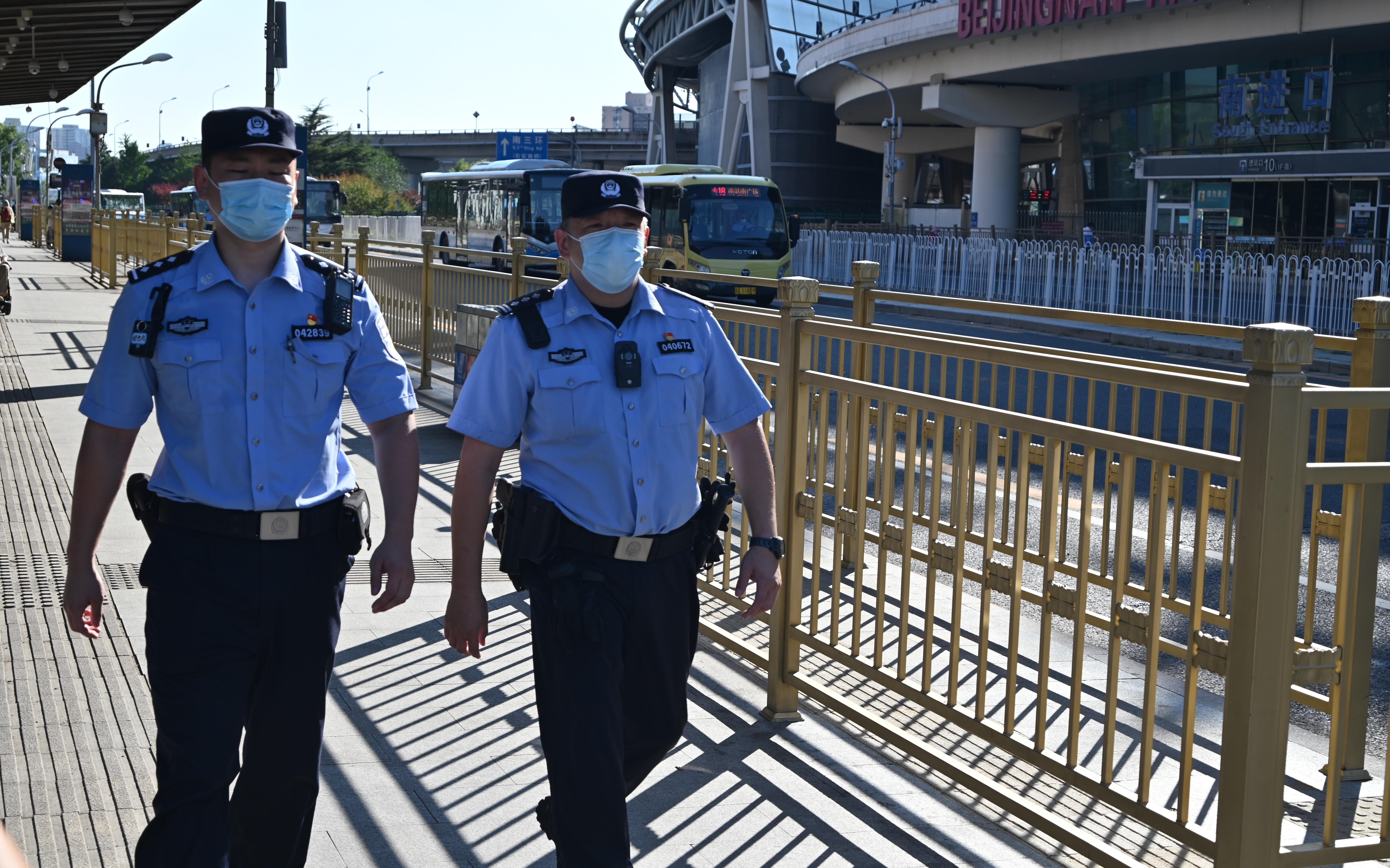 洋桥派出所民警在北京南站巡逻。新京报实习生 苏磊 摄