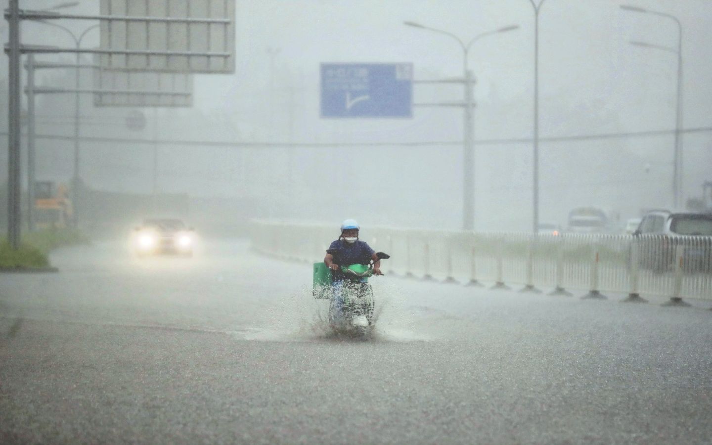 7月27日,小红门路,外卖员骑行通过涉水路段。 当天,北京市气象台发布暴雨蓝色预警。新京报记者 王飞 摄