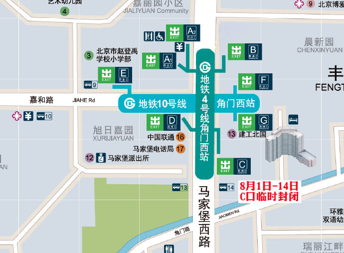 8月1日至14日,北京地铁4号线角门西站C出入口临时封闭