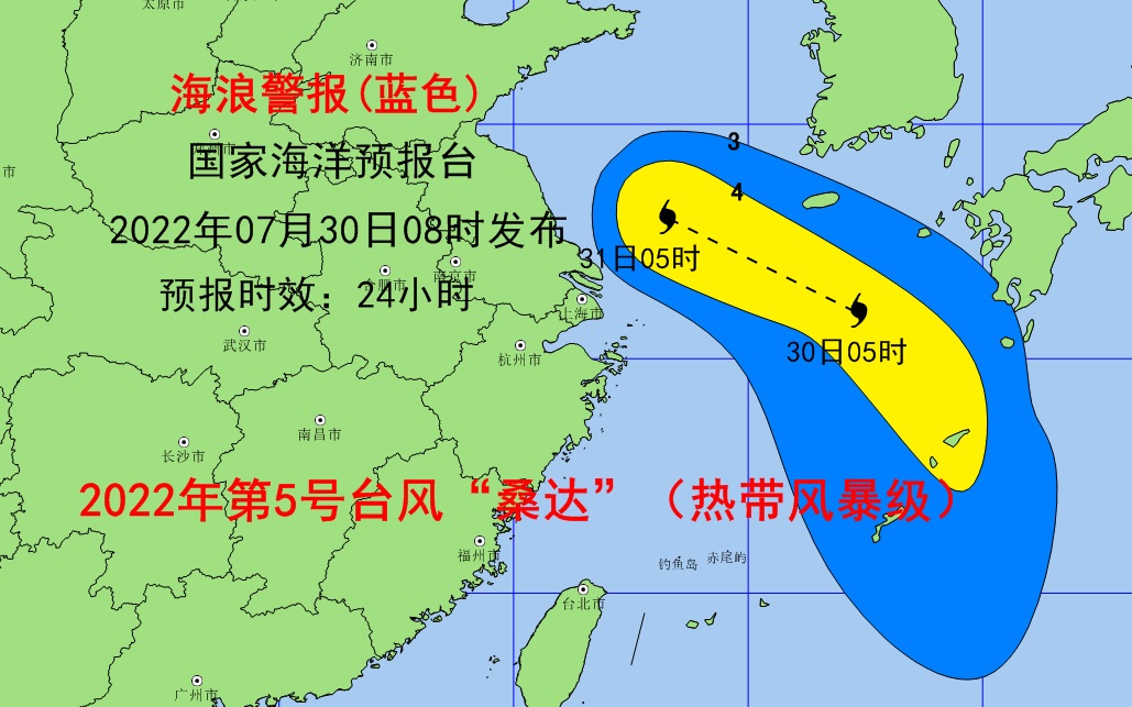 对此,国家海洋预报台根据《海洋灾害应急预案》发布海浪蓝色警报。 受台风“桑达”(热带风暴级)的影响,预计7月30日中午至31日中午,东海、黄海南部将出现3米至4.5米的大浪到巨浪区,江苏南部、上海、浙江北部近岸海域将出现1.5米到2.5米的中浪到大浪。近岸海域海浪预警级别为蓝色。