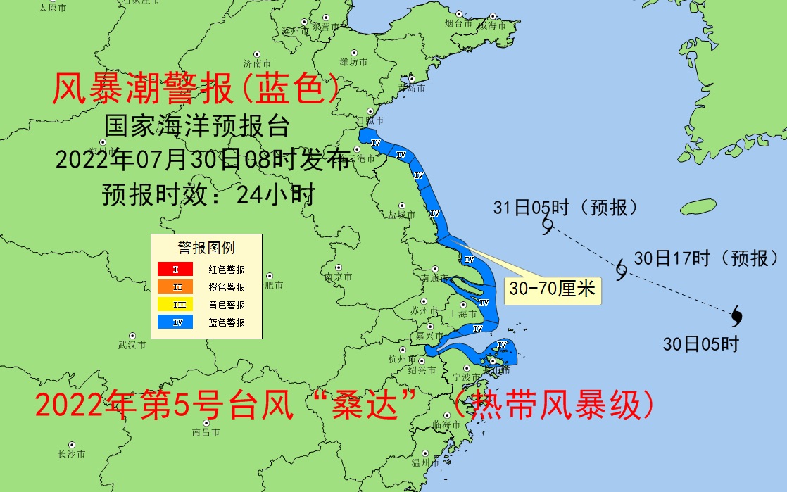 此外,国家海洋预报台同时发布风暴潮蓝色预警,预计7月30日下午到31日上午,江苏连云港到浙江舟山沿海将出现30厘米到70厘米的风暴增水。上海市、浙江省宁波市和舟山市的风暴潮预警级别为蓝色。国家海洋预报台表示,沿海政府及相关部门做好防御风暴潮的应急准备工作;各涉海相关单位采取积极有效的措施,组织渔船、养殖渔排、养殖场等做好防御工作;加固沿海渔业养殖水产设施和渔港设施,做好防潮准备。