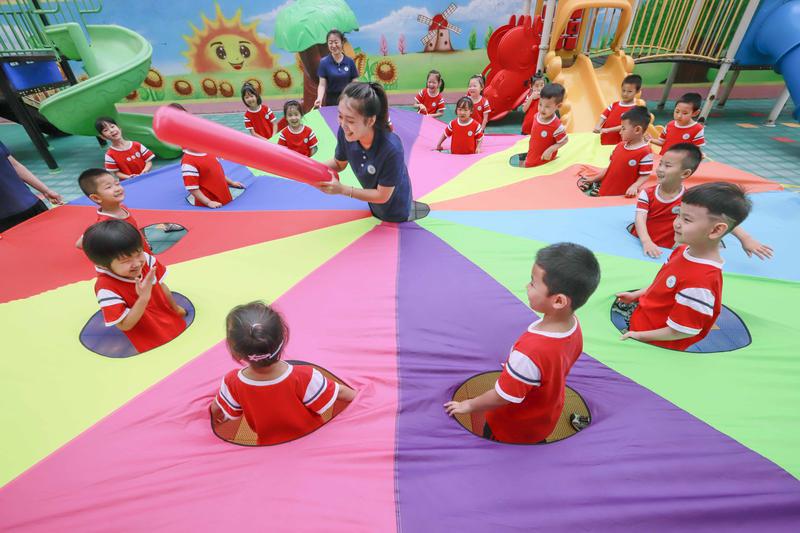 ▲2022年7月28日,河北省遵化市一所幼儿园的老师组织暑期托管班的孩子们做游戏。图/新华社