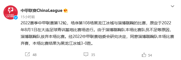 中甲联赛官方微博写道:2022赛季中甲联赛第12轮,场序第108场黑龙江冰城与淄博蹴鞠的比赛,原定于2022年8月1日在大连足球青训基地比赛场进行。由于淄博蹴鞠队本场比赛队员不足等原因,淄博蹴鞠队放弃本场比赛。经2022中甲联赛组委会研究决定,同意淄博蹴鞠队本场比赛弃赛,本场比赛结果为黑龙江冰城3比0胜。